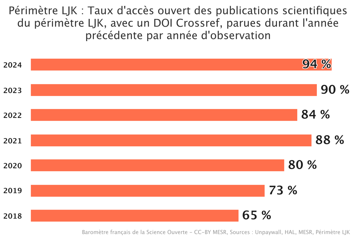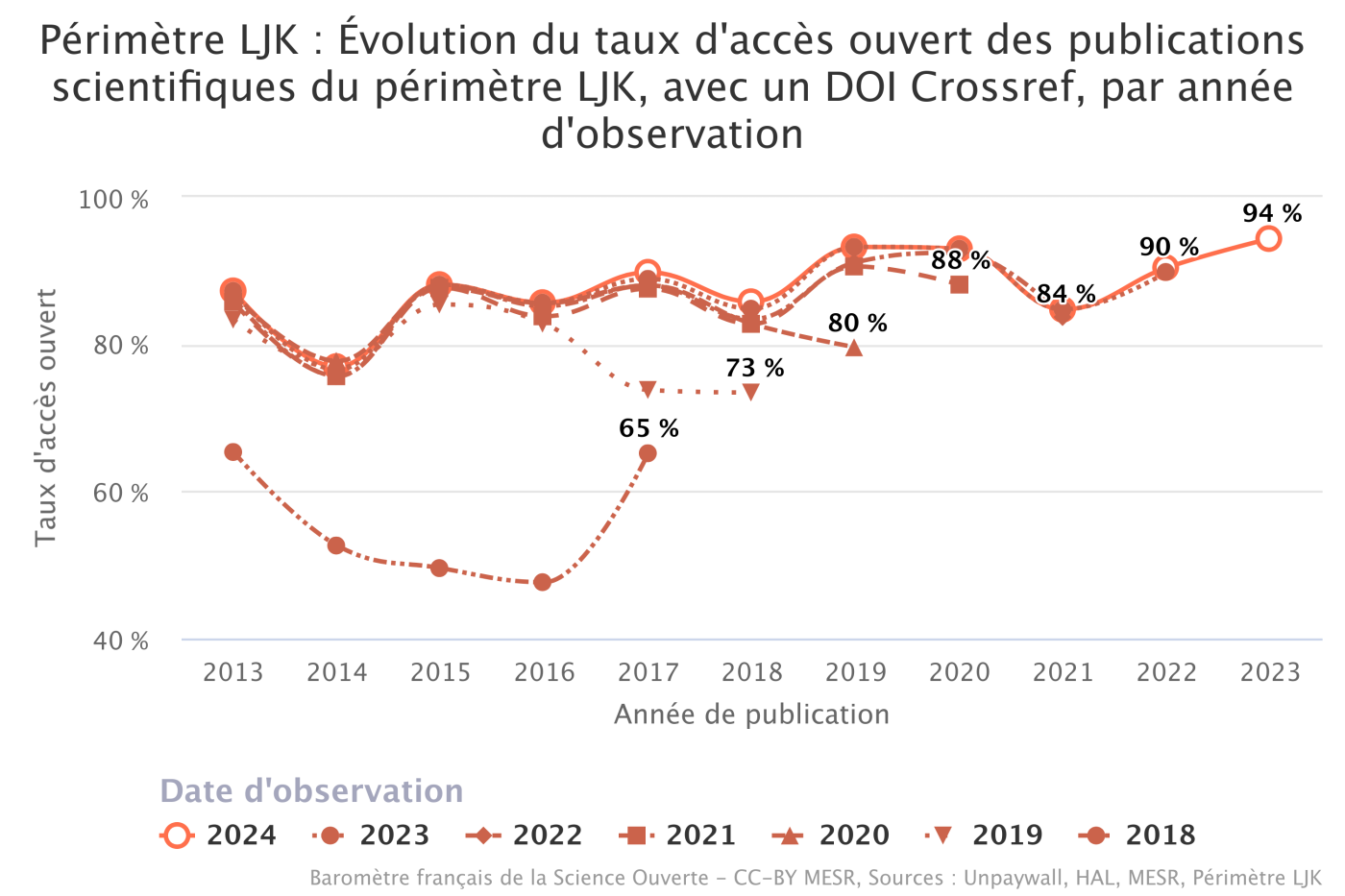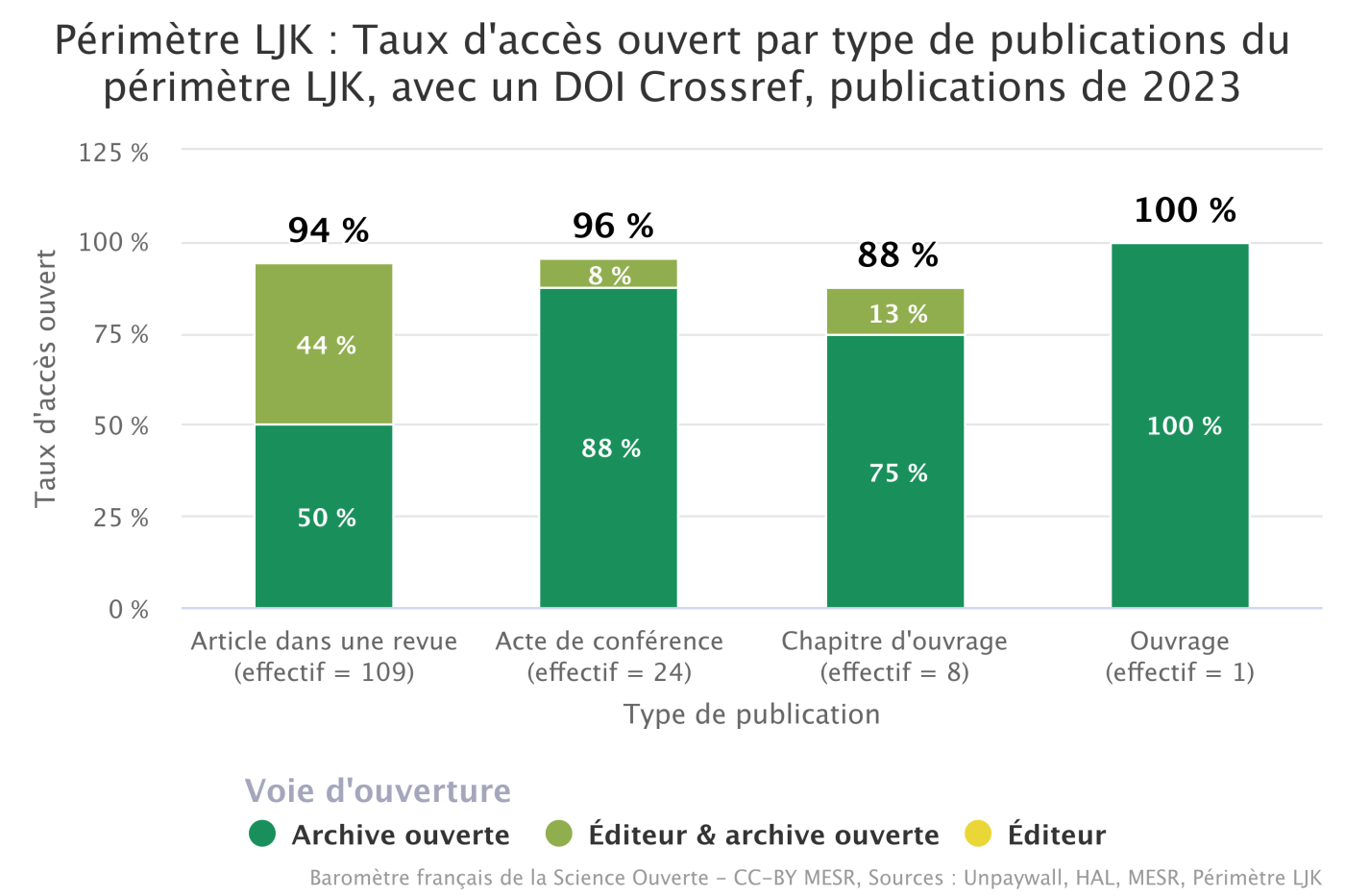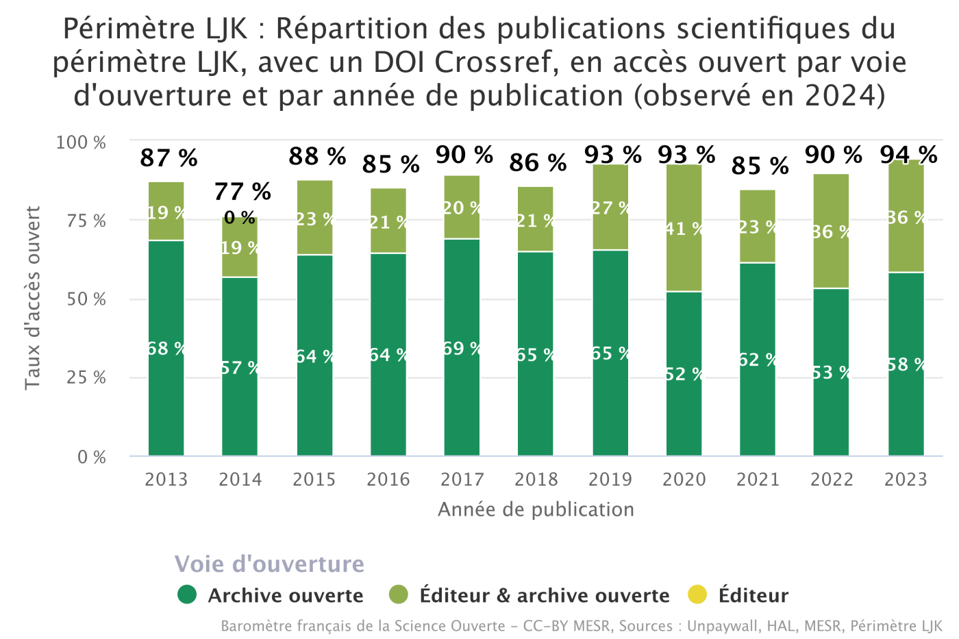 Le Baromètre Science Ouverte (BSO) du LJK montre un taux de publication en accès ouvert de plus de 94%, et une ouverture complète des thèses. Vous trouverez ci-dessous quelques statistiques issues du BSO. Les données présentées sont issues des publications déposées sur HAL, avec un DOI, entre 2013 et 2024.