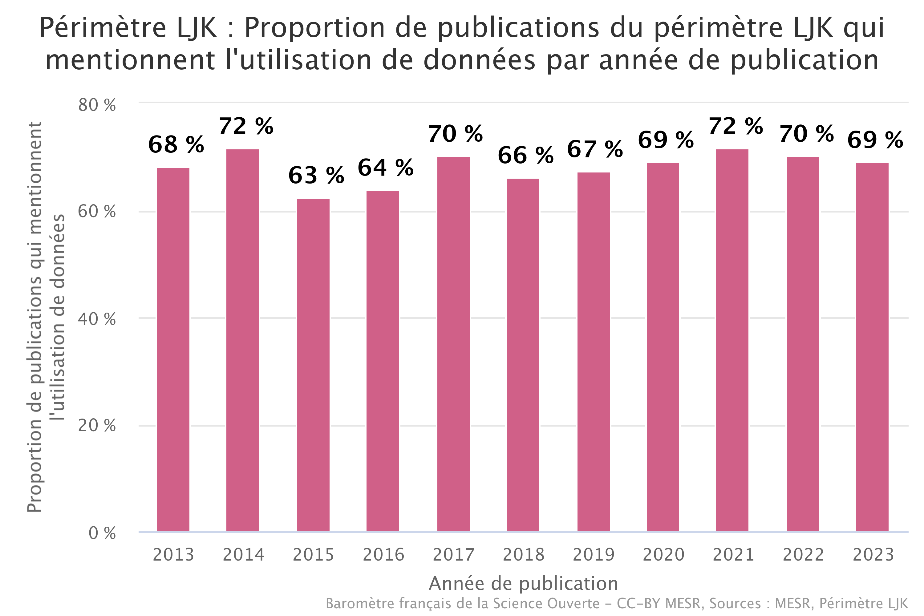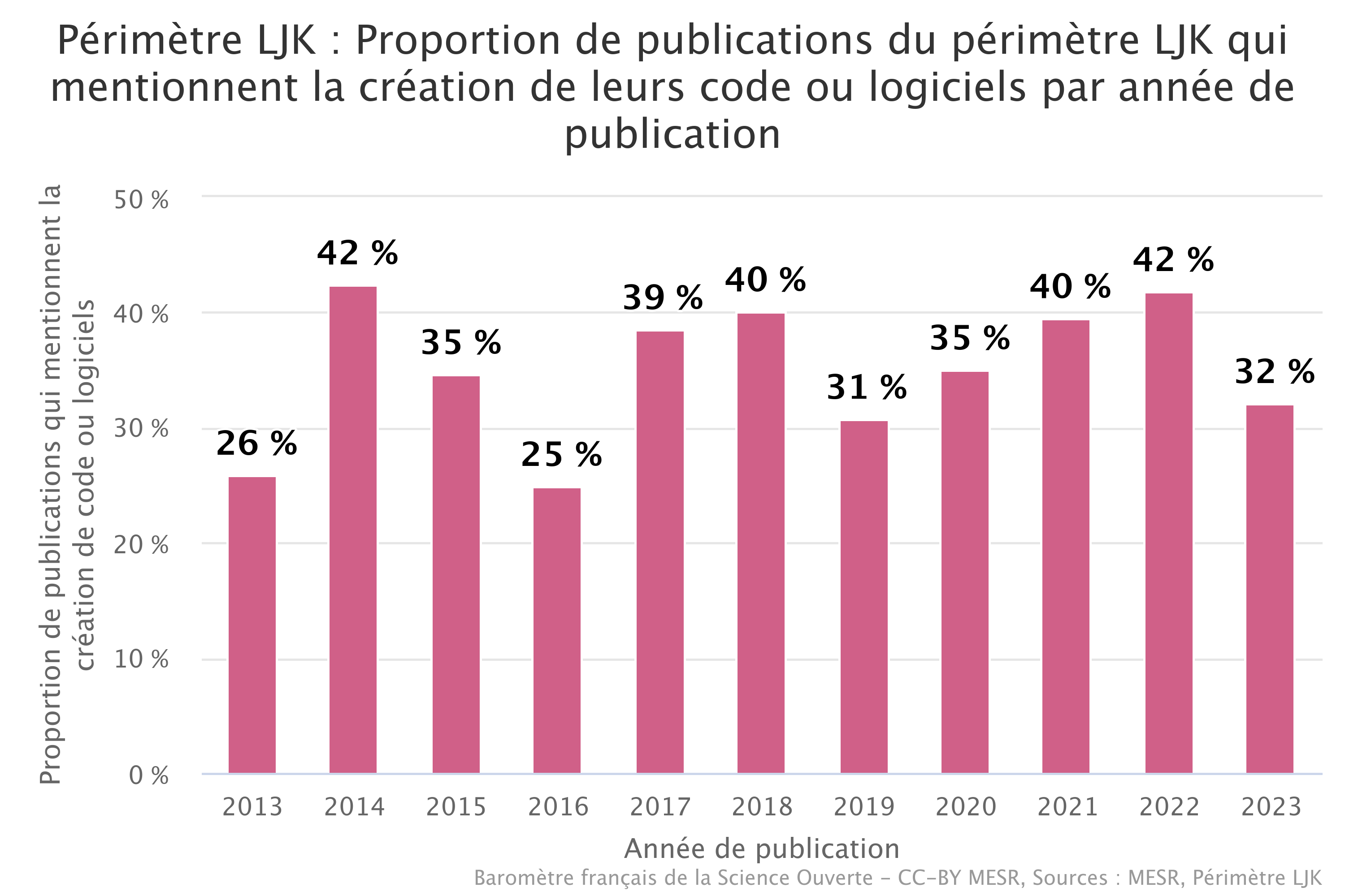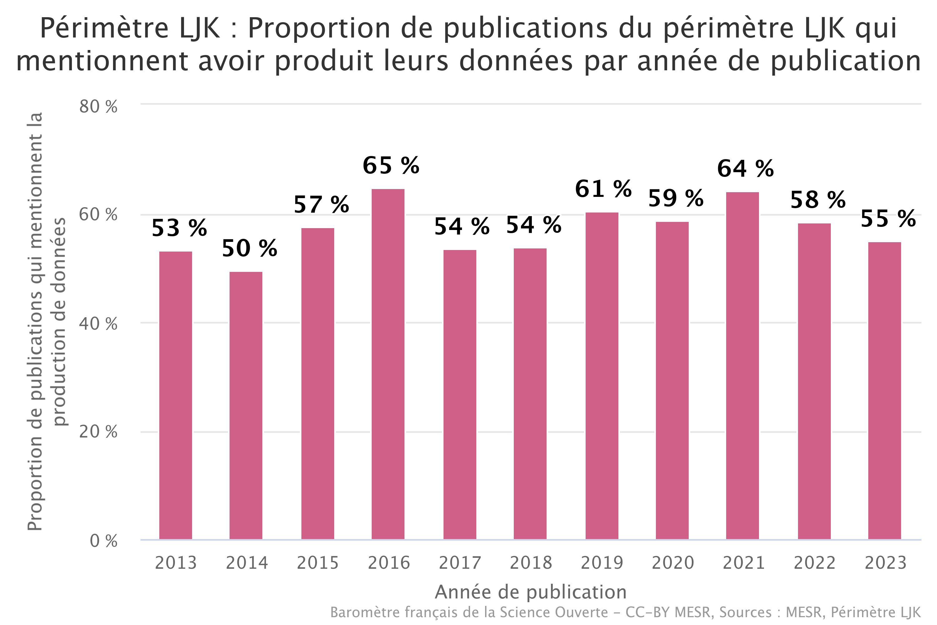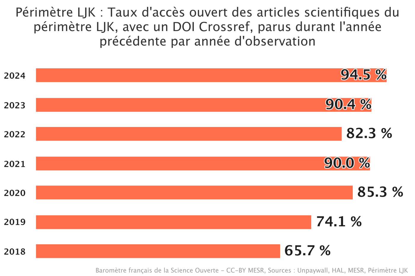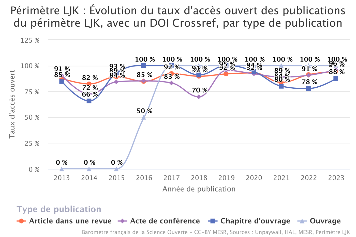 Le Baromètre Science Ouverte (BSO) du LJK montre un taux de publication en accès ouvert de plus de 94%, et une ouverture complète des thèses. Vous trouverez ci-dessous quelques statistiques issues du BSO. Les données présentées sont issues des publications déposées sur HAL, avec un DOI, entre 2013 et 2024.